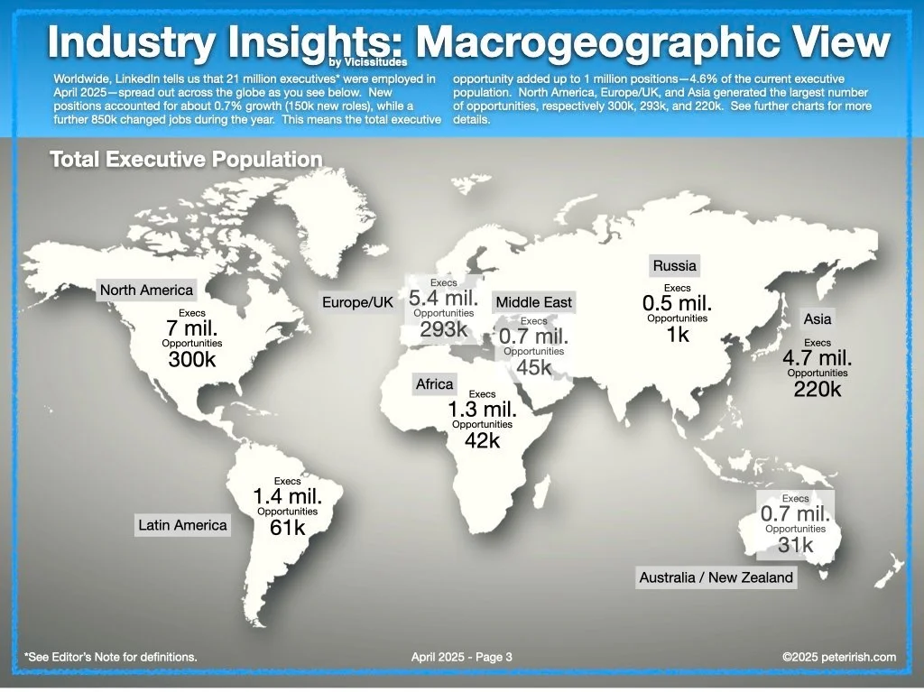 In the course of this document we will lay out how many executives work in each region, how that number is changing, what industries they primarily work in, what roles they play, their top specializations, and in some cases, the female share of executives. This last point is intended to highlight gender imbalances which are lamentably common in business activities in the hopes of encouraging positive change. In subsequent reports we expect to explore specific industries and regions in more depth. We welcome suggestions on where to focus. Let us know your thoughts.
